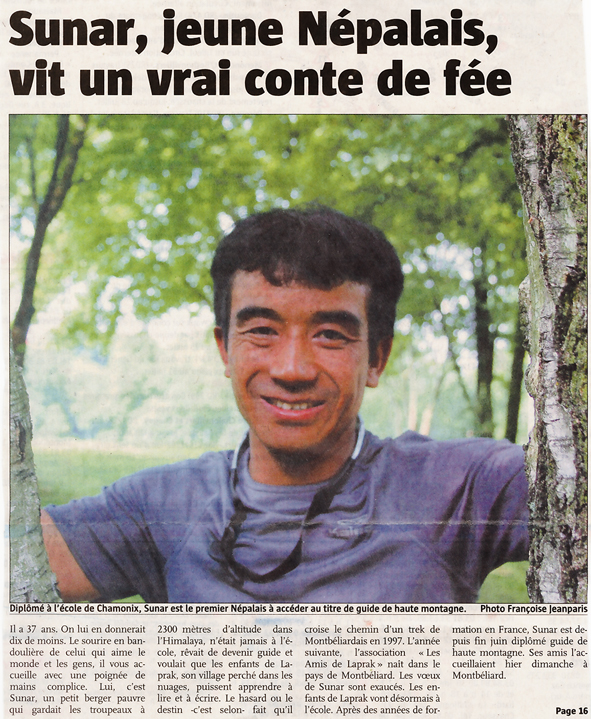 LE PRESS BOOK Les articles présentés ci dessous vont du dernier vers le premier. Le premier est un article paru au Népal dans la revue "Metro", suite à la réussite de l'expédition nationale népalaise "Tourism Népal 2011". On rappelle que l'objectif affiché par le Ministère du Tourisme Népalais était de faire gravir l'Everest (oui, le sommet à 8848 mètres ...) à une quinzaine de fonctionnaires des ministères népalais. Objectif ambitieux qui a été réussi puisque neuf fonctionnaires accompagnés de quinze sherpas, sont arrivés au sommet . Pour cette expé Sunar été le coordinateur technique entre le Ministère du Tourisme et l'équipe terrain. En particulier, c'est lui qui a sélectionné les candidats, qui les a entrainés en salle et sur le terrain (Langtang, puis ascension de l'Island peak)